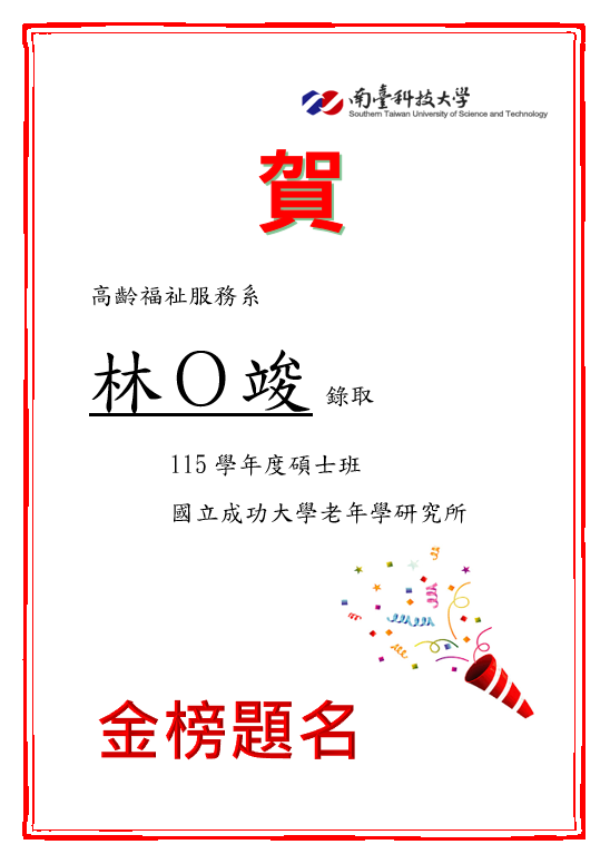 「賀」本系畢業生林o竣同學考上國立成功大學老年學研究所115學年度碩士班